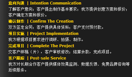 保證力——作業(yè)流程   我們一直相信,只有科學(xué)、規(guī)范的作業(yè)流程作為運(yùn)作保障,優(yōu)秀的創(chuàng)意才能得以完美的實(shí)施。在經(jīng)典影視,我們一直秉承——策略精準(zhǔn) . 創(chuàng)意新銳 . 執(zhí)行出色。